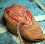 “利用口腔黏膜的尿道成形术”分两期完成。首次手术切除狭窄段(图1),已口腔黏膜替代(图2),尿道外口置于阴茎根部旷置(图3)。一年以后,尿道闭合,患者重新可以从阴茎排尿。